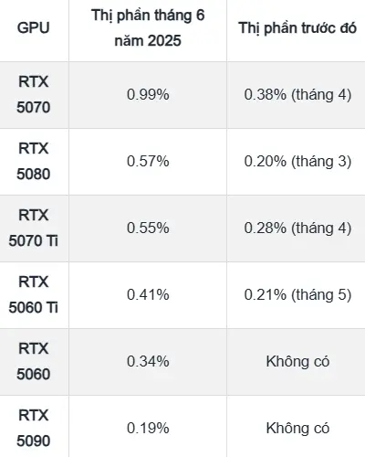 Khảo sát phần cứng hàng tháng từ Steam luôn được xem là “nhiệt kế” đo lường sức hút thực sự của các dòng linh kiện, đặc biệt là GPU trong cộng đồng game thủ toàn cầu. Tháng 6/2025 đánh dấu một bước ngoặt đáng chú ý khi các dòng card RTX 50 Series chính thức xuất hiện trong thống kê – điều chưa từng xảy ra trong những tháng trước đó.